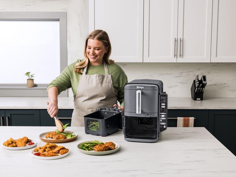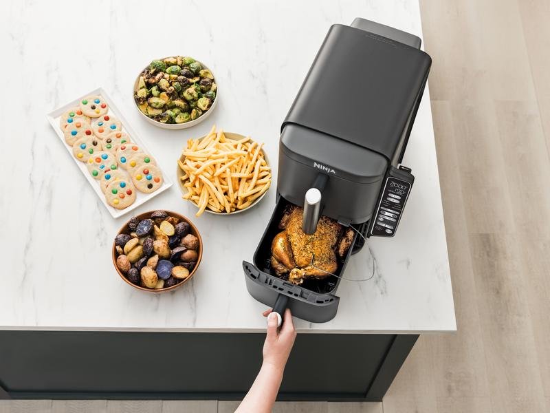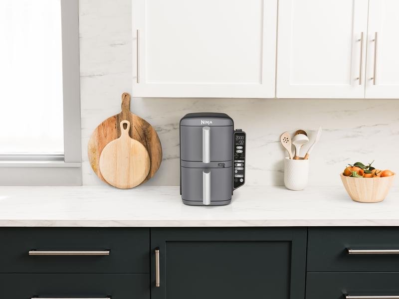 Meet the Ninja Stacked Dual Zone Air Fryer, your new kitchen hero! This space-saving marvel offers family-sized 9.5 litre cooking capacity with its innovative two-drawer design, while taking up minimal room on your countertop with a slimmer design. Enjoy faster, smarter cooking with six customisable functions – perfect for family feasts and unforgettable gatherings. Whether you’re preparing a quick bite or a crowd-pleasing favourite, this air fryer gives you more cooking power while taking up less space.Stack it like a Ninja – rear fans and wire racks allow you to cook up to four levels of evenly crisped food at once. Even with all that going on, you can feel smug knowing you’re cooking family favourites faster than in a traditional fan oven (tested against fish fingers and sausages), and using less energy (testing based on recommended cook time for sausages, using air fry function versus conventional ovens). DoubleStack technology – with the SYNC function, you can cook two meals in two different ways and finish exactly at the same time. And with MATCH mode, you can copy your settings across all levels. More taste, more space – reclaim your counterspace with this compact yet roomy air fryer, featuring space-saving stacked drawers that allow you to cook two foods at once and feed more people without the appliance taking over your counter. It can fit a whole 1.5kg roast chicken in each 4.75L drawer, feeding up to 8 people. Smart Cook System – simply insert the integrated Digital Cooking Probe, currently only available at QVC and Ninja direct, into meat or fish, select your food type and cook level, and the air fryer will let you know when your food is cooked to perfection. From medium-rare steaks to a perfectly roasted chicken, there’s no more worrying about undercooked or overcooked food. Easy to clean – the non-stick drawers, crisper plates and wire racks are all dishwasher-safe and easy to wipe clean. And if you’ve given your air fryer a polish and want to put it away, it’s designed to fit under cabinets. Six cooking functions – whether you’re preparing a roast or baking cookies for a family gathering, this air fryer gives you countless possibilities.
